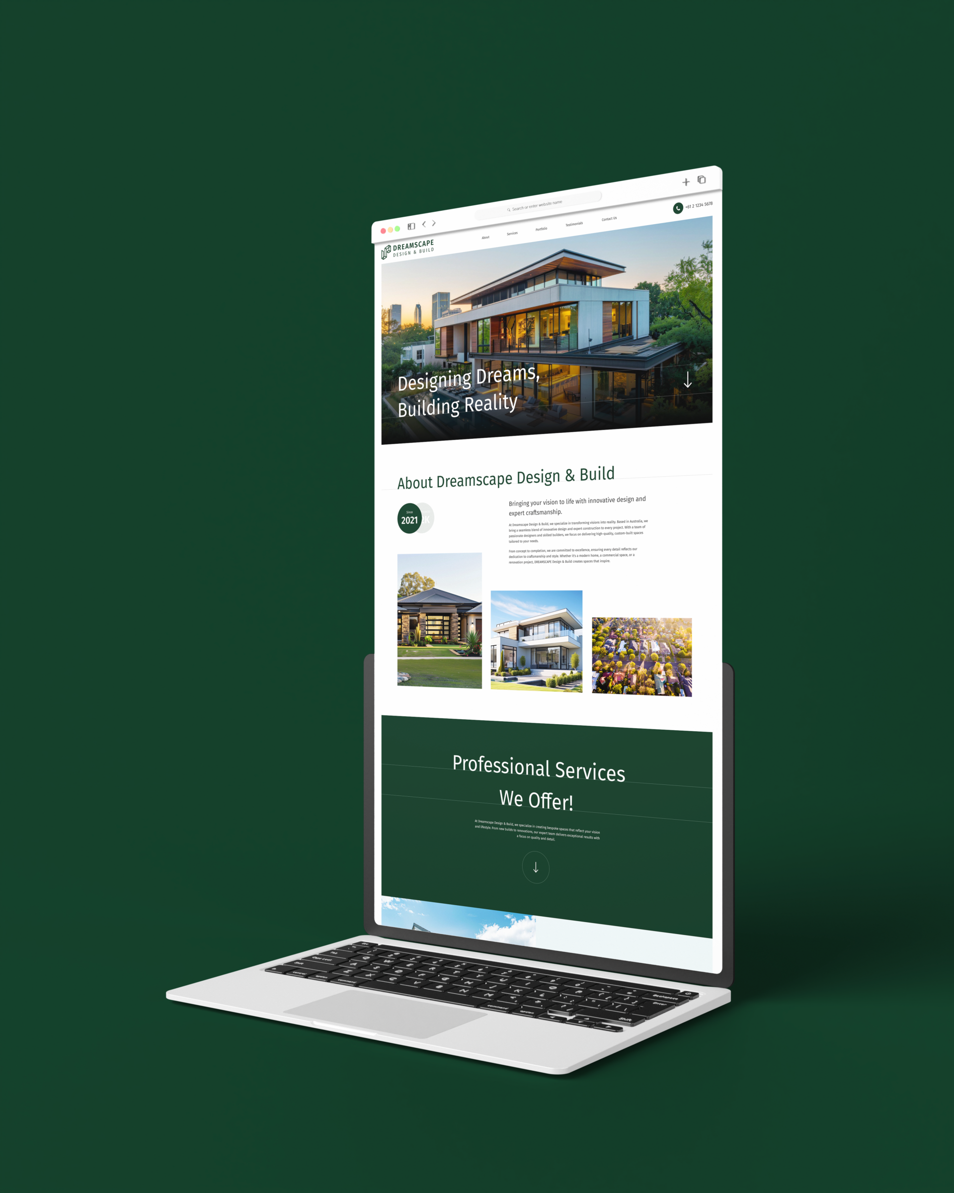 Dreamscape Design & Build faced challenges with their digital presence, including an outdated website that did not accurately reflect their innovative architectural capabilities or extensive project portfolio. Potential clients found it difficult to navigate the site, locate examples of past work, and understand the company’s full range of services. This resulted in reduced user engagement, lower inquiry rates, and missed opportunities to showcase their expertise to prospective clients. The key problem was to redesign the website to provide a visually inspiring, intuitive, and information-rich experience that builds trust and encourages prospective clients to take action.