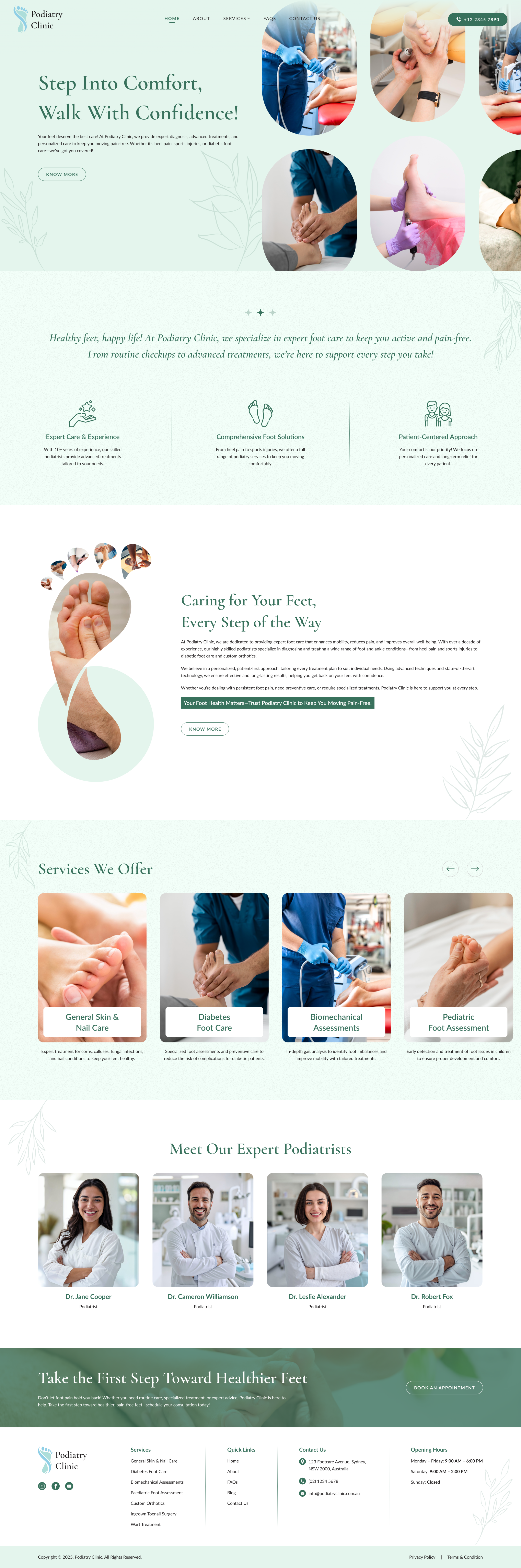 For the Podiatry Clinic project, I designed a brand-new website from scratch to establish the clinic’s digital presence and build patient trust. The main challenges included creating everything from branding to information architecture, simplifying complex service information, and ensuring an easy appointment booking process. My approach focused on a clean, professional interface with calming colors, well-structured content, and mobile-first responsive design. The result was a modern, user-friendly website that communicates credibility, educates patients effectively, and streamlines the booking experience.